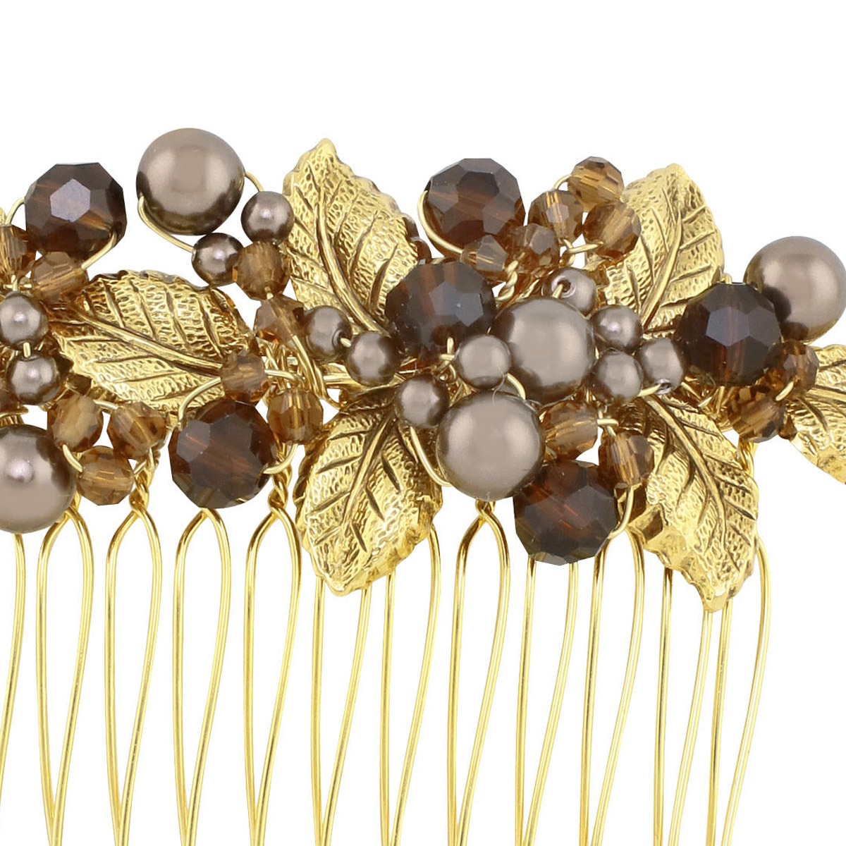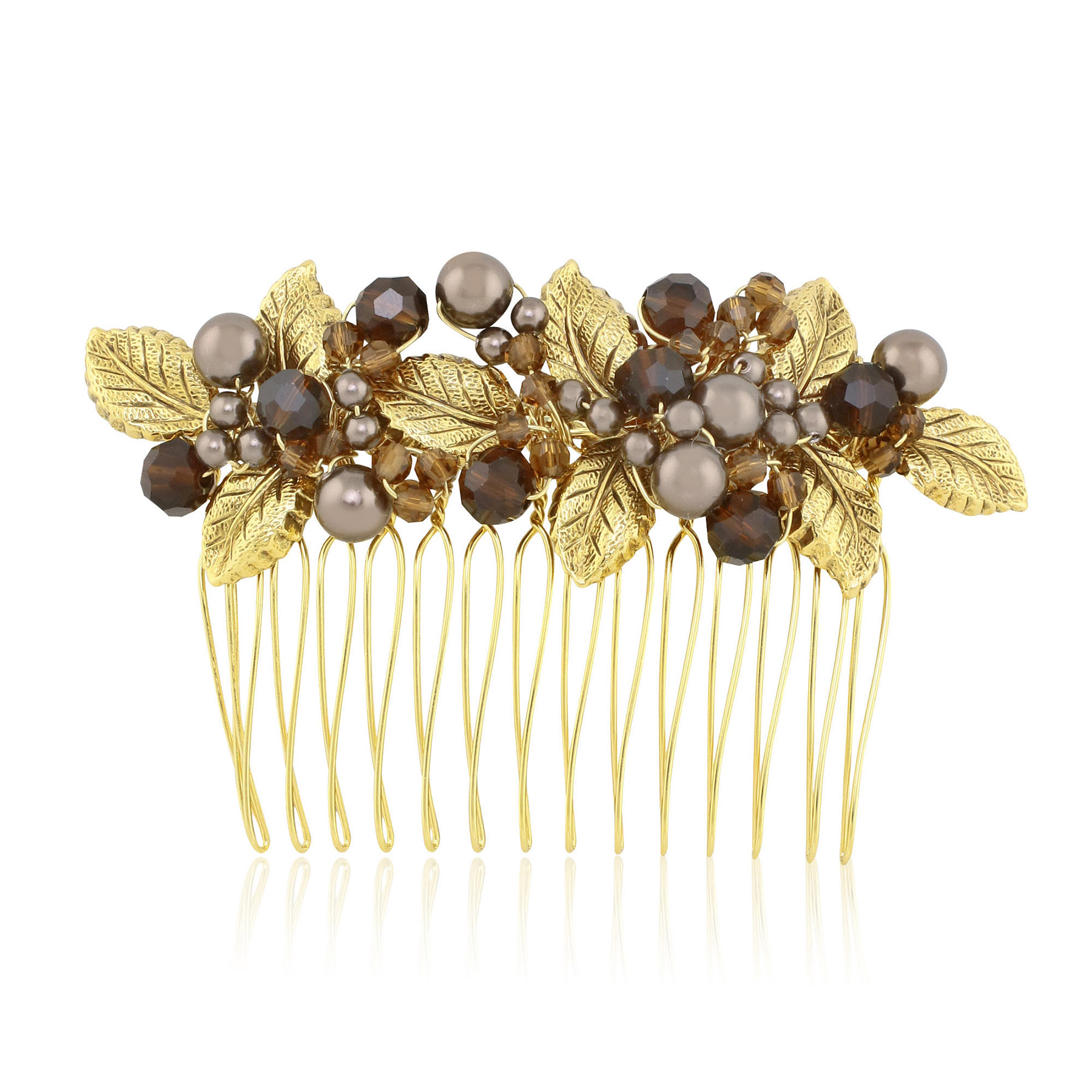 A rich mixture of Swarovski® pearls and crystals in deep brown shades mixed with antique gold plated leaves is a perfect style for year round chic!